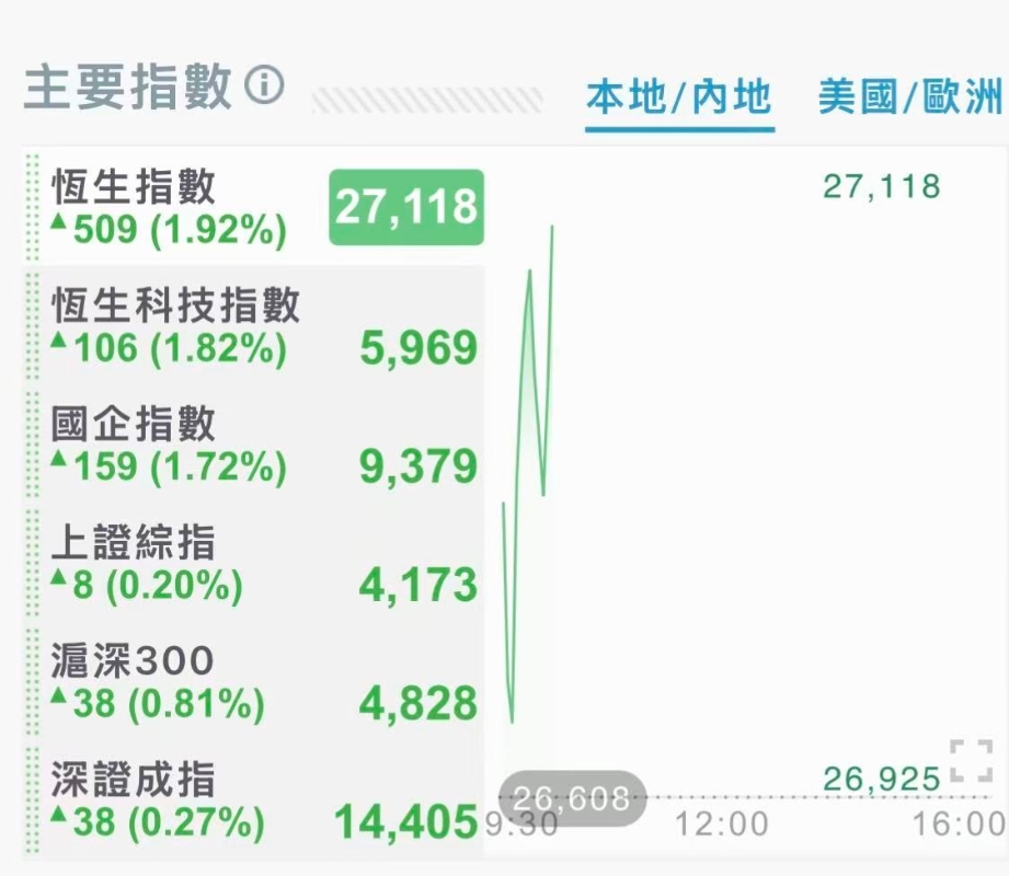 恒指高開350點,報26958點後升幅擴大。截至早上10時10分左右,恒指報27118點,升509點或1.92%。