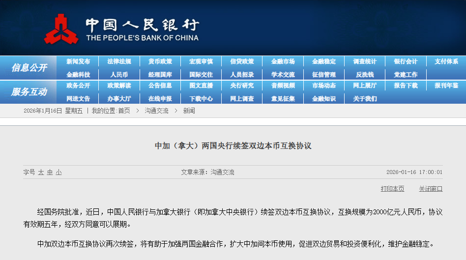 香港中通社1月16日電 據中國人民銀行網站1月16日消息,中國與加拿大兩國央行續簽雙邊本幣互換協議。互換規模為2000億元人民幣,協議有效期五年,經雙方同意可以展期。