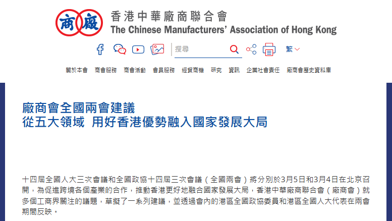 廠商會官網截圖 廠商會指出,全球產業鏈與供應鏈正在加快重組,驅使許多內地企業“揚帆出海”,而香港具有“背靠祖國、面向世界”優勢,具備條件擔當中介橋樑和全方位的增值服務平台,協助內地企業“走出去”。但目前,商業仍希望相關流程可以得以簡化。 廠商會建議內地有關部門積極倡導並支持內地企業視香港作為“出海”的首選指揮中心與增值服務平台。其具體措施包括簡化業務備案及核准的流程、外匯資金靈活調配、以及便利人員跨境流動管理等多方面,為內地企業“走出去”鋪設順暢通道。 同時,為協助內地企業進入香港市場和提升海外推廣的效益,廠商會建議,應鼓勵各地的行業協會與商會組織代表團,或由特區政府商務部門牽頭赴港舉辦地方特色產品、地理標誌或民族品牌的推介會與交流活動。 此外,廠商會也建議內地相關部門為赴香港參展或參加市場推廣活動的中小企業提供差旅資助和其他津貼;鼓勵企業來港舉行新產品“首發”活動,並提供資金扶持及海關快速通道等便利措施。 同時,為鼓勵內地企業採用香港高品質專業服務,廠商會建議內地相關部門與香港對口機構加強合作,完善企業經香港“出海”的信息收集和傳播機制,加大對香港供應鏈管理增值服務優勢的宣傳力度。 十四屆全國人大三次會議和全國政協十四屆三次會議將分別於3月5日和3月4日在北京開幕。廠商會除了草擬了優化內地企業出海的相關建議外,也對推廣“灣區標準”、保護香港品牌、碳市場合作及促進國家ESG標準體系建設等另外4個領域作出建議。上述建議通過會內的港區全國政協委員和港區全國人大代表在兩會期間反映。 (完) 【編輯:梁嘉軒】