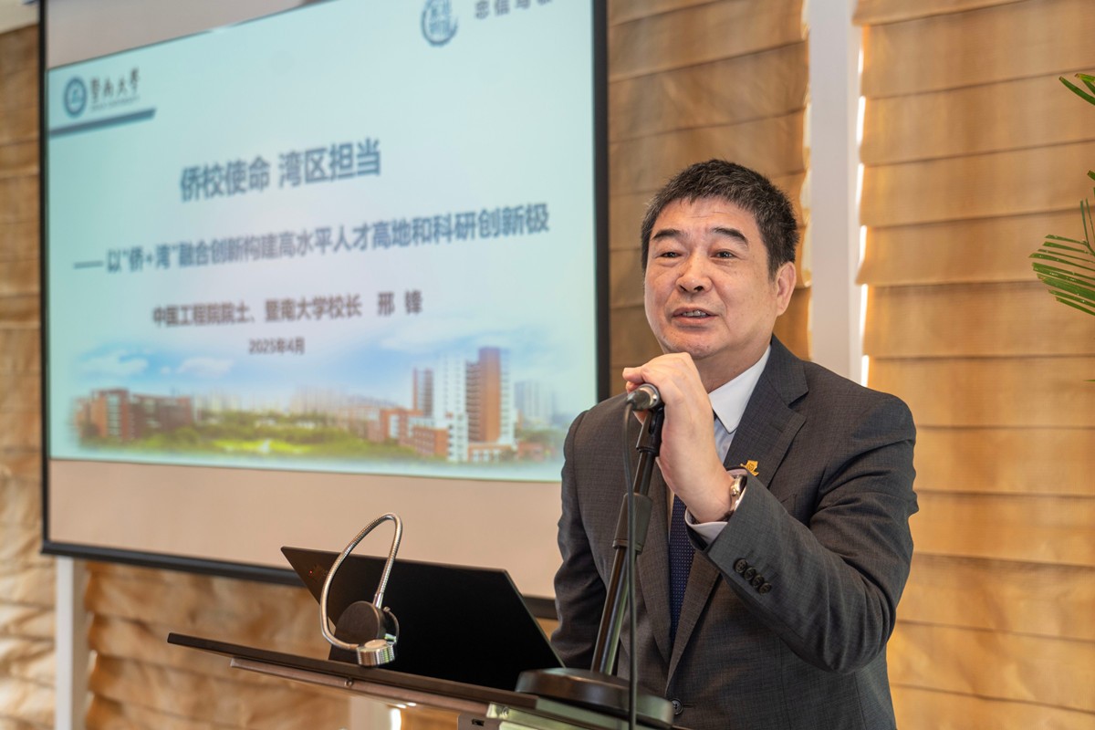 邢鋒校長作《僑校使命 灣區擔當》報告 會上,與會人員通過觀看宣傳片了解了暨南大學港澳子弟學校的發展情況。作為粵港澳大灣區基礎教育融合的示範項目,暨南大學港澳子弟學校由暨南大學與香港維港教育集團合作創辦。目前,該項目已在廣州、東莞、佛山三地成功開辦學校,致力於為國家所需、灣區所盼的教育事業貢獻力量。 資料顯示,暨南大學作為國內最早成立董事會的高校之一,廣納賢才助力發展。在暨南大學第九屆董事會中,余國春、霍震寰、蔡冠深、陳永棋、方文雄、石漢基、李文俊、李國華、楊孫西、何超琼、龔中心、曾智明、蒙德揚、戴德豐等23位來自香港各界的傑出人士出任校董,他們為促進內地與香港教育交流、支持暨南大學建設發展作出了重要貢獻。暨南大學香港校友組織蓬勃發展,現已組建13個各類組織。校友組織充分發揮橋梁紐帶作用,通過參與社會公益、推動行業交流等,為香港的長期繁榮穩定注入動力。 此次交流會進一步密切了暨南大學與香港各界的聯繫,未來,暨南大學期待與香港社會各界朋友、校董校友繼續攜手同行,圍繞教育、科技、人才等領域深化合作,為粵港澳大灣區協同發展作出新的更大貢獻。 在港期間,邢鋒一行拜訪了中央人民政府駐香港特別行政區聯絡辦公室副主任羅永綱,並走訪了香港理工大學、香港大學、香港城市大學,調研了香港大學全國重點實驗室,拜訪了香港中國企業協會、霍英東集團等,就進一步深化產學研成果轉化、學術交流、人才聯合培養、學生就業等方面的合作,協同推進粵港澳大灣區建設等進行深入交流。(完) 【編輯:黎金良】
