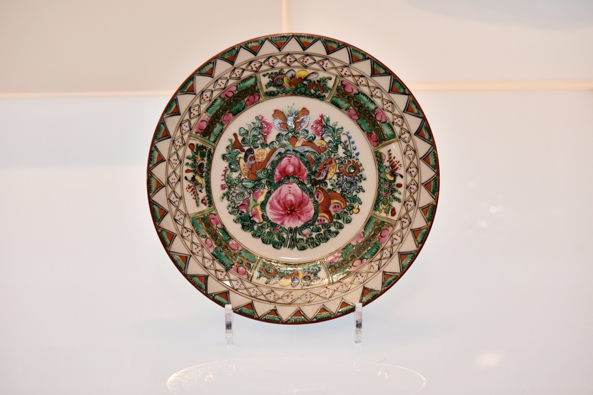 粵東磁廠收藏的這件“廣彩牙邊花心碟”,於上世紀六十年代由畫師王年手繪,展現港彩黃金時代的工藝精髓。(圖源:粵東磁廠) 1928年,廣州匠人曹侶松攜技藝南下香港,創辦“錦華隆廣彩瓷廠”(今粵東磁廠),開啟“港彩”篇章。彼時的香港作為自由港,吸引歐美商行訂製瓷器,粵東磁廠全盛時期有300名工匠,為半島酒店、太古洋行等客戶製作餐具,更創出標誌性“督花”紋樣——1975年,當時的港督麥理浩夫人委託仿製青花瓷,其融合英式圖案與廣彩金邊的設計,成為港彩中西合璧的經典。
