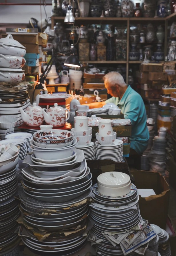 走進粵東磁廠,狹窄的小路兩旁堆滿了形形色色的彩瓷餐具。(香港中通社記者 黃璇攝)