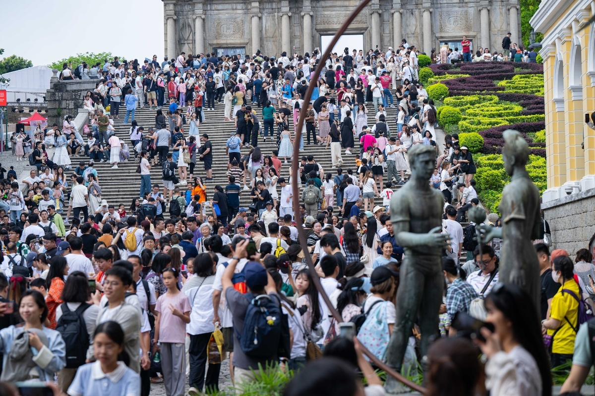 資料圖:旅客在澳門大三巴牌坊前觀光。香港中通社圖片 當中,日均63.3萬人次通關,較去年同期增長10.8%。此外,關閘口岸已於5月30日率先突破5000萬人次通關;橫琴口岸及港珠澳大橋澳門口岸亦於5月7日及9日先後錄得年度1000萬人次通關,較往年提前達成。(完) 【編輯:彭玉婷】