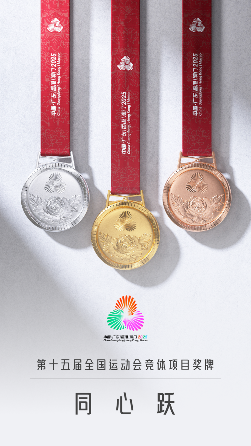 (圖源:第十五屆全國運動會組織委員會網站) 綬帶設計以“中國紅”為基調、採用“三花映牡丹”主題花紋,將國花牡丹花、廣州市花木棉、香港特區市花紫荊花和澳門特區市花蓮花融入其中,比喻三地同心協力綻放光彩,相互輝映,獎牌的掛環採用“同心結”設計,靈感來自港珠澳大橋,寓意三地團結一心 競技體育項目獎牌重354.5克,一面正中上方的會徽由代表粵港澳三地的花瓣交疊扭轉形成同心禮花,下方牡丹花托舉而上,寓意粵港澳大灣區依託祖國的堅實後盾蓬勃發展,為民族復興貢獻力量。 獎牌的另一面,中間的吉祥物中華白海豚手舉火炬,靈動活潑,周圍浪濤造型的數字“15”巧妙地將全運會屆別與體育精神的傳承完美結合。 群眾賽事活動的獎牌亦在當日活動發佈,獎牌特別刻上“發展體育運動 增強人民體質”引用時任國家領導人為中華全國體育總會成立大會所作的題字,體現中華民族對強身健體、增強體魄的體育精神追求。 獎牌由香港周大福珠寶集團的4位設計師和1位廣州美術學院的教師組成。團隊成員林鴻勝介紹,這枚獎牌代表粵港澳三地同心協力,共躍未來,所以取名“同心躍”。(完) 【編輯:淩玉輝】