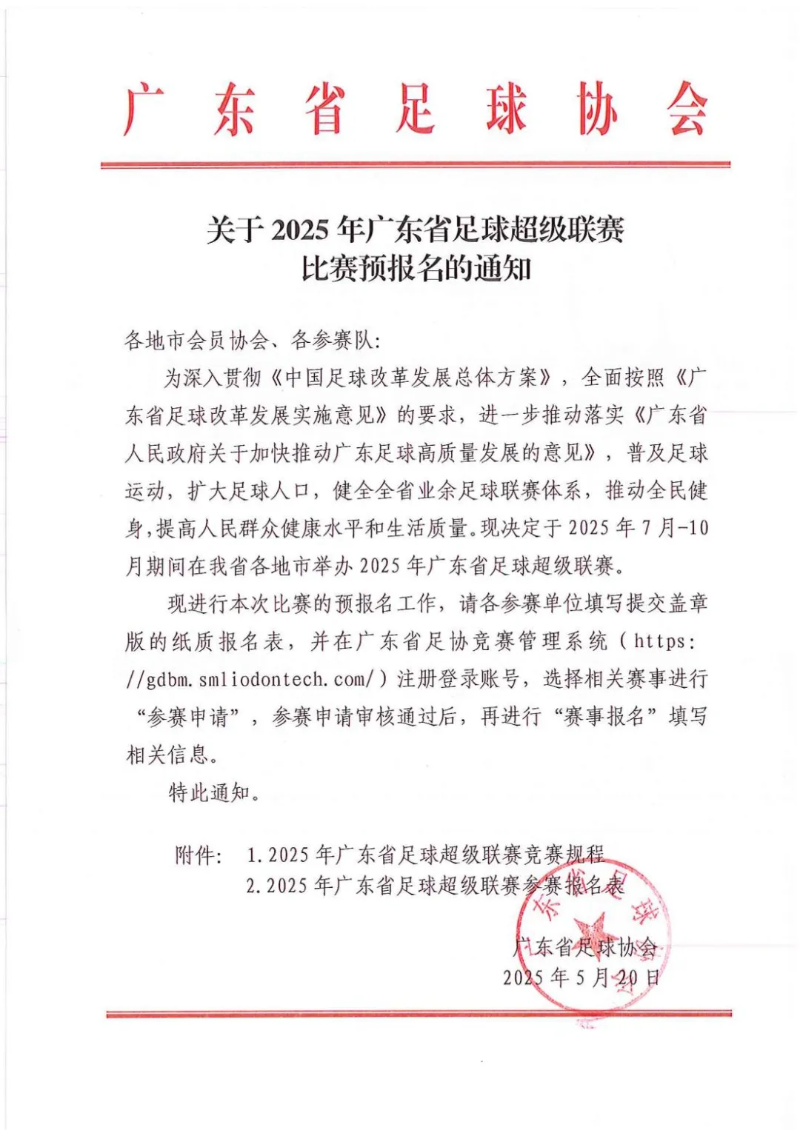 圖源:廣東省足協 據“深圳發布”6月10日消息,近日,廣東省足協官網發布通知,本年度省超聯賽的參賽俱樂部數量不超過16家(隊)。比賽第一階段地點為省內各賽會制地點,第二階段為各晉級參賽俱樂部主場。 而與“蘇超”不同的是,“粵超”並不是一項新晉賽事,該賽事早在2015年就已創辦,2018年更名為廣東省足球協會超級聯賽,2022年更名為廣東省足球超級聯賽。 具體到參賽球隊方面,“粵超”參賽隊伍更多是各地區自行組建,但不是按照城市組隊,廣東省足協根據各地市的足球發展狀況,綜合確定各地參賽俱樂部名額數量。 根據規定,“粵超”禁止外籍人士參賽,同時也對報名球員的職業經歷有所限制:禁止參加過2025中超、中甲、中乙、俱樂部U19-21聯賽、五超聯賽,以及香港、台灣地區職業聯賽註冊報名的運動員參賽。 值得注意的是,“粵超”允許來自港澳台地區的運動員報名參賽,每隊可註冊3名港澳台球員,每場可同時上場2人。 此前,江蘇省首屆城市足球聯賽,被網友稱為“蘇超”的省級賽事,自5月10日揭幕以來,相關話題頻頻登上中國網絡熱搜,由單純的體育賽事演變為全民熱議的社會現象和文化符號。(完) 【編輯:彭玉婷】