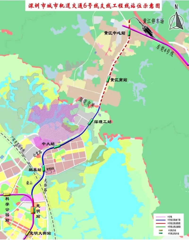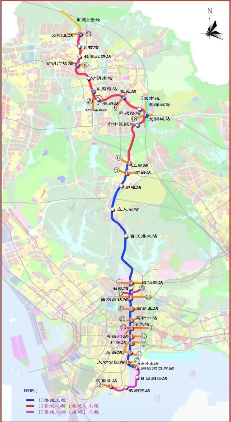 深圳地鐵6號線支線線路示意圖,站名以實際建成為準。 深圳地鐵13號線北延段起自上屋站,止於公明北站,線路全長約19.23公里,共設站11座,是西部偏東次一級交通走廊的快速線路。線路北端預留與東莞軌道交通5號線換乘條件,通車後,從光明科學城45分鐘即可通達深圳灣口岸。