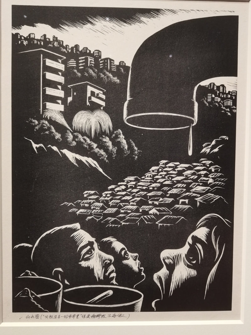 黃新波組畫《出現在另一個世界裡》其一。(呂紀星攝) 粵港兩地間的情感牽絆與精神嚮往,同樣是廣東藝術家們筆下的重要主題。黃新波的組畫《出現在另一個世界裡》,便回望了他在香港的經歷。畫面中,寮屋區移民張口等待水龍頭滴水的場景,與背景中光鮮現代主義建築旁幾乎滿溢的裝飾噴泉形成鮮明對比。 據悉,儘管黃新波於1949年返回廣州,其創作中仍深蘊對香港的牽掛。同樣,許多從內地遷居香港的藝術家,筆墨間也常流露出濃厚的思鄉之情。這種跨越地理空間的互望與寄託,或正是粵港兩地文化血脈相連的深刻寫照。