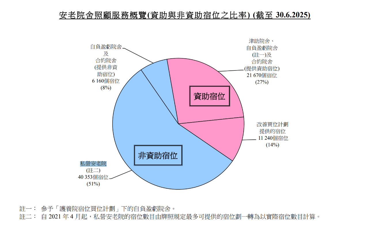 圖源:香港特區政府社會福利署 然而,香港的安老院舍服務數量極其有限。根據特區政府社會福利署截至2025年6月30日的數據,香港共有約8萬個安老院舍照顧服務宿位,其中逾4.6萬個為非資助宿位,其中約4萬個由私營安老院提供。 根據現行入住香港受資助安老宿位的相關政策,其對象一般為年齡達65歲或以上,由於個人、社會、健康及或其他原因而未能在家中居住的長者。而年齡介乎60至64歲之間的人士亦可提出申請,但須證實確有需要接受住宿照顧。