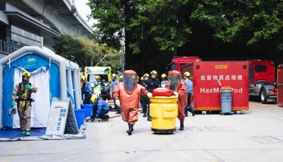 香港新聞網9月13日電 香港消防處13日於社交媒體發文表示,消防處與深圳市消防救援支隊,聯同警務處、入境處、海關和民眾安全服務隊,當日在深圳灣口岸旅檢大樓舉行危害物質事故聯合演練,以模擬深港分界線位置有刺激性物質洩漏和火警事故,現場有工作人員及旅客受傷的情況。