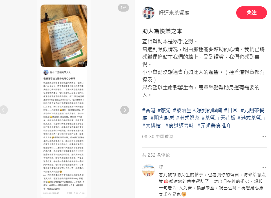 茶餐廳老闆在小紅書上見到貼文後,也發文回應此事件,表示“助人為快樂之本”。(小紅書截圖) 而茶餐廳老闆在小紅書上看到這則貼文後,也在評論區回覆:“不用客氣,舉手之勞,我們已將你的便條貼在我們的墻上,受到讚賞,我們也感到喜悅,小小舉動沒想過會有如此大的迴響。往後常來香港旅遊。”媒體前往採訪這間茶餐廳的老闆,老板稱,理解遊客在異地遇到的困難,並簡單地表示:“我只是做了應該做的事。” 這則“小紅書”帖文迅速獲得大量點讚和留言,網友們紛紛稱讚老闆的善舉,並表示這份超越商業利益的人情味令人感動。“真的很妙,老闆的茶餐廳叫‘好運來’,這又何嘗不是因為散發的善意而迎來了好運呢!”“好人會遇到好人”,“香港很好,去過幾次很喜歡,遇到的人也都很真誠善良。”還有元朗居民表示“身為元朗居民也很愛去這家店!學生時期已經在吃……如果想要體驗比較地道、遊客少的茶餐廳,十分推薦這家。”(完) 【編輯:黃璇】