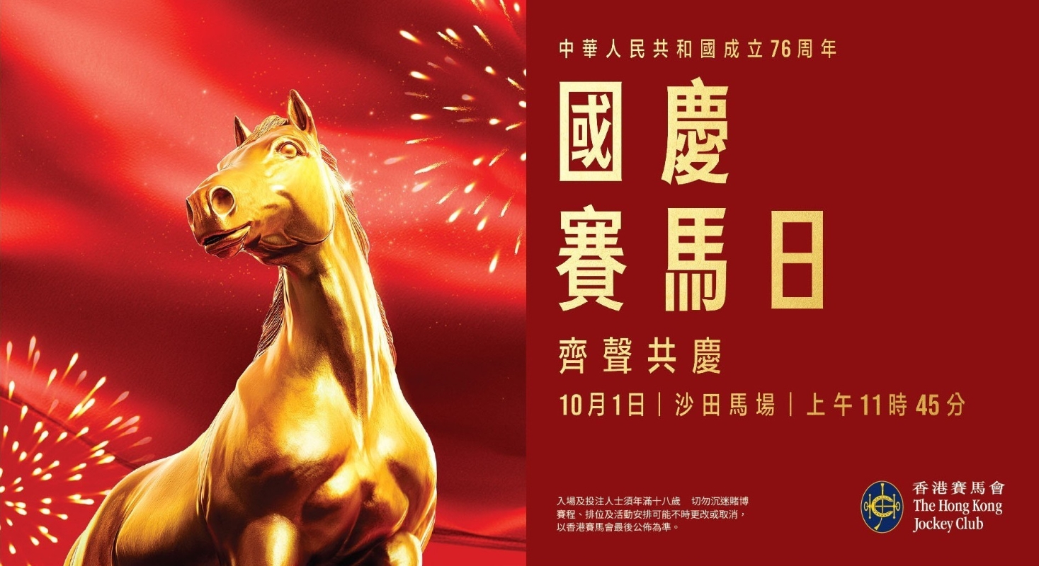 10月1日,沙田馬場舉辦“國慶賽馬日”,焦點賽事“國慶盃”熱鬧開跑,現場還有音樂表演、國技展示、美食佳餚,並邀請中國歌舞劇院著名青年男高音張英席傾情獻唱。當日沙田及跑馬地公眾席免費入場,市民可親身感受國慶盛事的熾熱氣氛。