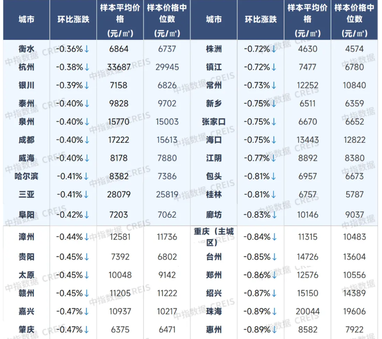 9月百城新建住宅價格及環比漲跌幅(圖源:中指研究院)