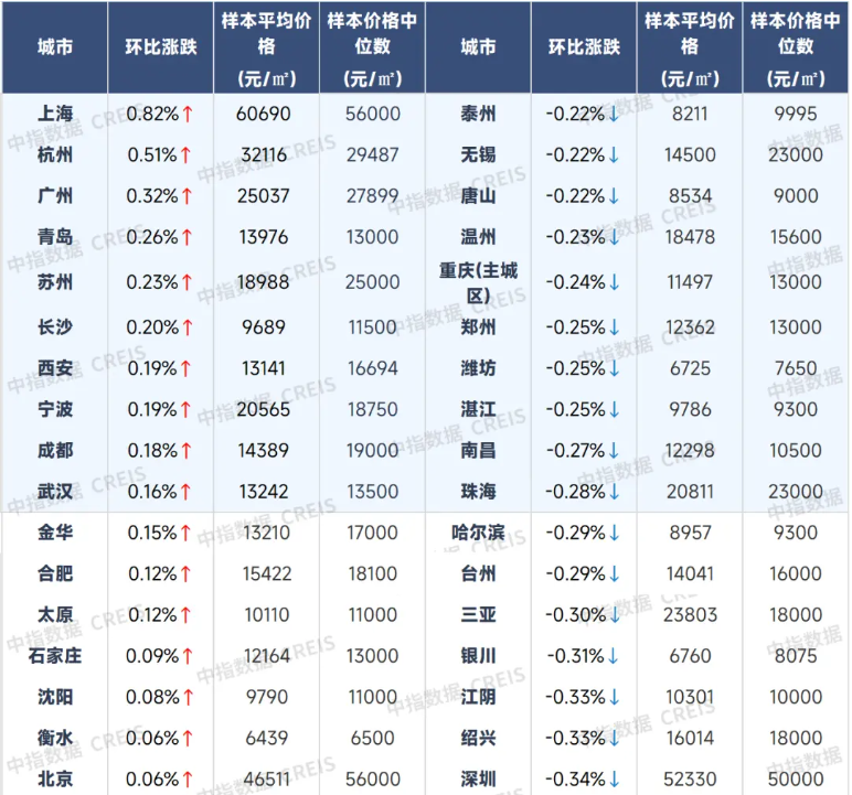 具體來看,上海(+0.82%)、杭州(+0.51%)、廣州(+0.32%)、青島(+0.26%)、蘇州(+0.23%)等城市新建住宅價格環比漲幅靠前。