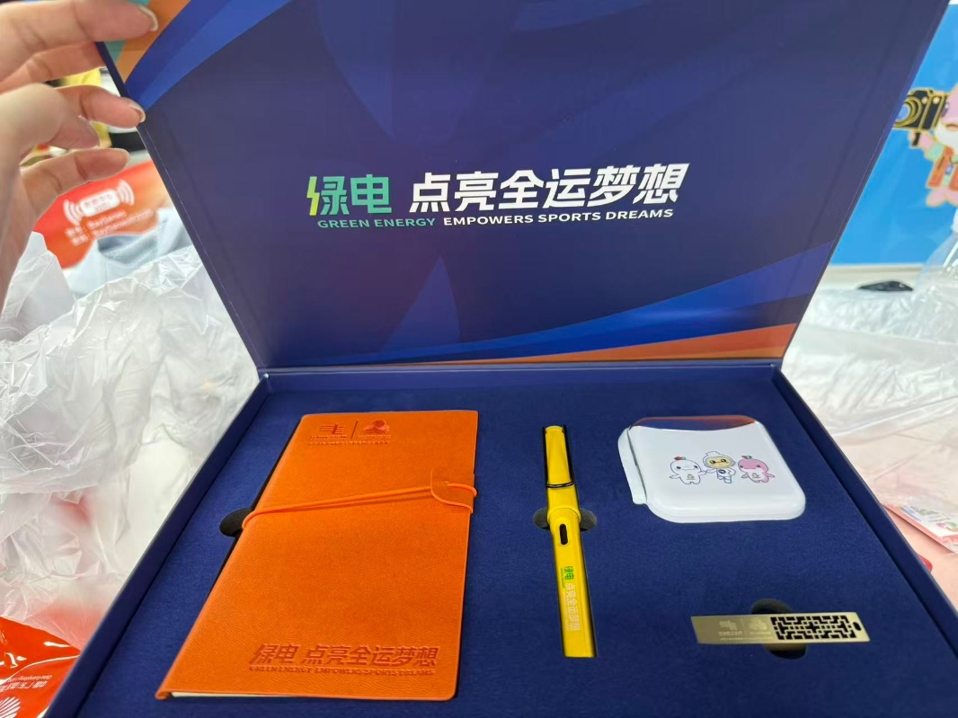 印有吉祥物“喜洋洋樂融融”圖案的充電寶、筆記本、U盤,等辦公用品,雨傘、保溫杯也是記者們必不可少的。