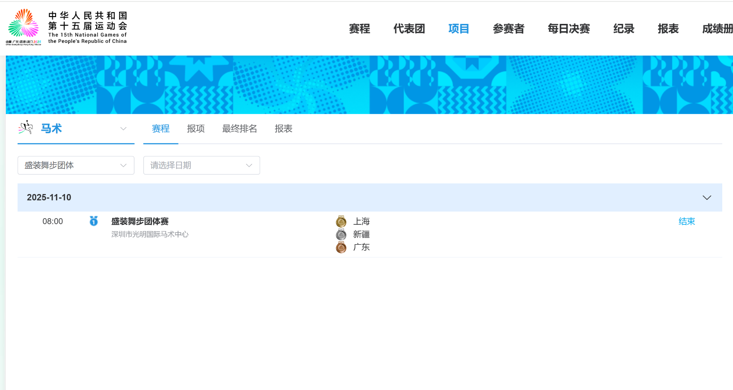 圖源:深圳發佈 十五運馬術項目共設盛裝舞步、三項賽和場地障礙3個分項,每個分項均分設團體賽與個人賽,將產生6枚金牌。首個比賽日決出盛裝舞步團體賽金牌,上海隊成功摘金,這是十五運正式開幕後深圳賽區誕生的首枚金牌。新疆隊、廣東隊分獲銀、銅牌。