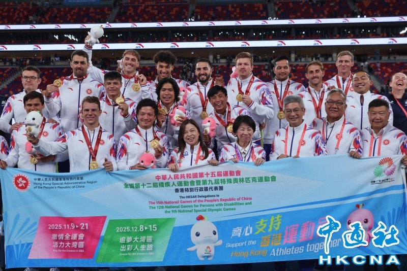 11月14日晚,香港特區政府文化體育及旅遊局局長羅淑佩熱烈祝賀中國香港欖球運動員於全運會奪得男子7人制橄欖球金牌。圖為頒獎典禮後,羅淑佩和運動員合影。香港中通社圖片 當天是周五,啟德主場館越夜越火熱。記者現場所見,隨著下班人潮湧入,啟德主場館看台席上逐漸坐滿手持“齊撐全運”海報、揮舞印有“香港”二字打氣毛巾的市民,等待一睹男子港隊與山東隊的金牌之爭。 男子港隊在今屆全運會由開賽至今未嘗一敗,以“四戰四勝”姿態殺入決賽,對手山東隊被視為最強勁敵,因港隊曾在2013年全運會橄欖球決賽惜敗山東隊,與金牌擦肩而過;山東隊更是近三屆金牌得主。不過今年,兩隊曾在分組賽對壘,當時港隊以24:12取勝。 至於女子港隊,當天下午在名次賽以24:7力克上海隊收下勝利,第5名完成賽事。 有中學橄欖球隊老師與20多名學生組隊前來,希望學生學習經驗。場邊亦有資深球迷,與伴侶回憶2013年男子港隊憾負山東隊,希望這次在主場贏回來。 當晚,男子港隊勢如破竹,開場三分鐘,港隊房傑鋒成功達陣,看台瞬間爆發出歡呼吶喊聲,其後靴貝特再下一城,附加攻門得7分,上半場港隊以12:7領先優勢進入中場休息。 此時,場內響起經典節奏《We Will Rock You》,瞬間引發全場大合唱,觀眾用整齊劃一的跺腳聲與鼓掌為港隊助威,一遍遍高喊“HONG KONG”,盡顯主場氣勢。 下半場開局,山東隊馬豪翔達陣,追加射門得分,反超前14:12,港隊在落後壓力下迅速調整心態,雙方展開激烈拉鋸,于力仁在關鍵時刻達陣,拜恩菲立斯追加罰球,港隊拉開19:14。 最後1分鐘,後備入替的李卡度達陣,加上罰球取分,港隊領先26:14。山東隊雖有劉魯達“梅開二度”,但無法扳回敗局。最終港隊以26:19擊敗山東隊,歷史性首奪全運會金牌。這也是港隊在今屆全運會的第四面金牌。(完) 【編輯:馬華】