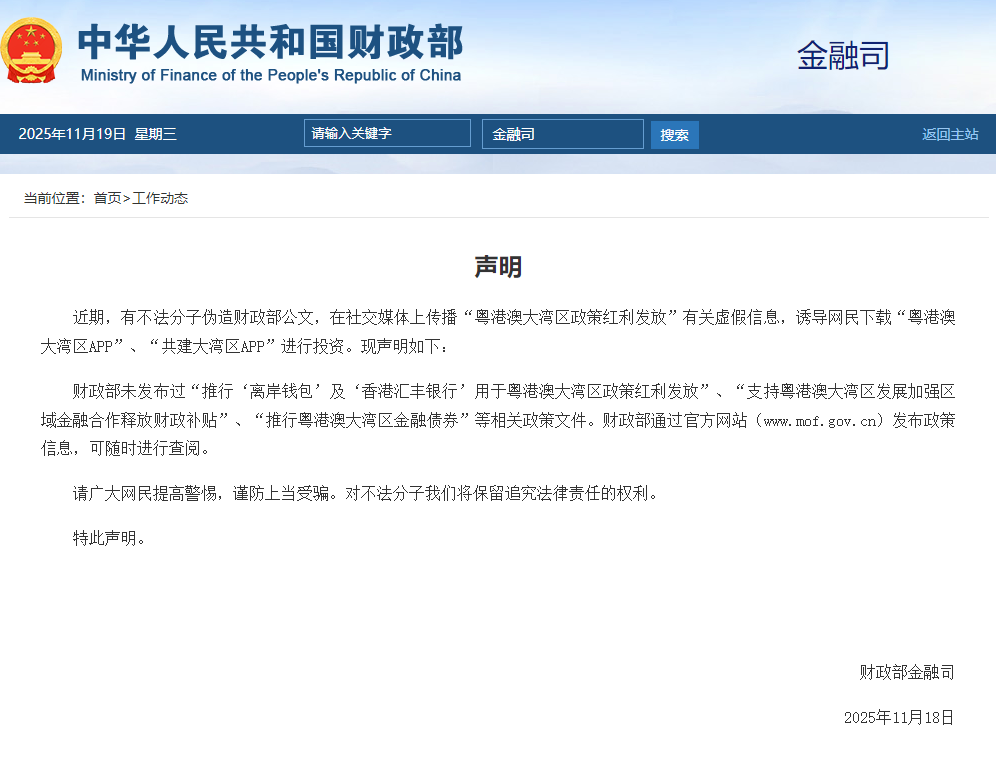 (圖源:中國財政部官網) 據中國財政部官網消息,聲明稱,近期,有不法分子偽造財政部公文,在社交媒體上傳播“粵港澳大灣區政策紅利發放”有關虛假信息,誘導網民下載“粵港澳大灣區APP”、“共建大灣區APP”進行投資。 聲明澄清,財政部未發布過“推行‘離岸錢包’及‘香港匯豐銀行’用於粵港澳大灣區政策紅利發放”、“支持粵港澳大灣區發展加強區域金融合作釋放財政補貼”、“推行粵港澳大灣區金融債券”等相關政策文件。財政部通過官方網站發布政策信息,可隨時進行查閱。 財政部金融司提醒網民提高警惕,謹防上當受騙,並將對不法分子保留追究法律責任的權利。 據南方都市報報道,此前,有網友在社交平台發布過“粵港澳大灣區App”在今年7月曾發布分紅暫停的公告。此外,也有不少網友反映該App出現多次拖欠分紅的情況。(完) 【編輯:石歡歡】