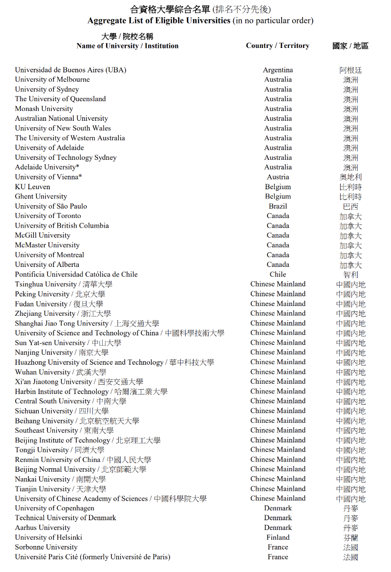 香港新聞網12月29日電香港政府公佈高才通計劃經年度更新的合資格大學綜合名單,4所大學被刪除,並新增5所大學,總數由199間增至200間。 新增的大學包括位於澳洲的Adelaide University、 奧地利的University of Vienna,德國的Karlsruhe Institute of Technology,意大利的Politecnico di Milano,以及沙特阿拉伯的King Fahd University of Petroleum & Minerals。 4所被刪除的大學,包括3間法國的大學,分別是Ecole Polytechnique、Université Grenoble Alpes、Universite Sorbonne Paris Cite-USPC,和德國的University of Freiburg。 經更新的綜合名單將於2026年1月1日生效。 高才通計劃旨在吸引下列三類人才: A類:在緊接申請前一年,全年收入達港幣250萬元或以上的人士; B類:獲綜合名單中的大學/院校(合資格大學/院校)頒授全日制學士課程學位、並在緊接申請前五年內累積至少三年工作經驗的人士;或 C類:在緊接申請前五年內,獲合資格大學/院校頒授全日制學士課程學位,但工作經驗少於三年的人士。 現時,綜合名單涵蓋四個世界大學排行榜(即泰晤士高等教育世界大學排名、Quacquarelli Symonds(QS)世界大學排名、美國新聞與世界報道全球最佳大學排名及上海交通大學世界大學學術排名)過去五年所列的百強大學/院校;過去五年在QS世界大學排名“酒店及休閒管理”範疇位列前五名專門提供酒店課程的大學/院校;過去五年在QS世界大學排名“藝術與設計”範疇位列前五名的專科學院;以及過去五年於《上海交通大學中國大學排名》位列首20名的內地大學。