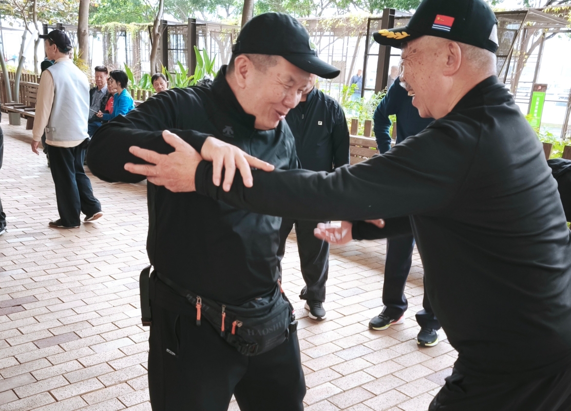 香港新聞網1月29日電(記者洪少葵)1月29日清晨,在香港觀塘海濱公園練習的一群太極拳、武術愛好者,各展其技,場面熱鬧。當天,來自廣東順德的蘇恆、陳亞玲、陳文凉拳友正和太極師傅們切磋推手,樂也融融。 順德推手養生文化俱樂部東主蘇恆自2016年開始玩推手,為之癡迷,隨後致力推廣太極推手文化,也經常組織交流分享活動。當天,蘇恆一行到訪官塘海濱交流,據介紹,2020年蘇恆開始創建順德推手養生文化俱樂部,經過幾年的發展,該會所成為主旨“講飲,講食,講太極”,集沉香文化,飲食文化,茶藝和太極融合一體的場所,吸引眾多同道同好參與。