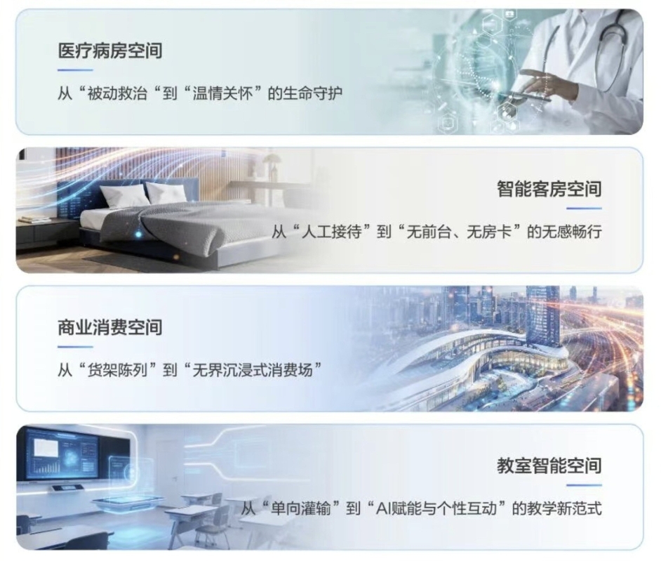 從全球範圍看,技術創新浪潮不斷演進。當下,鴻蒙+AI正在孵化和定義全新的智能空間,釋放巨大的產業機遇。何霽介紹,智能空間有各種應用場景,如:在智能辦公空間,“環境自適應”倍增生產力;在智能客房,可以做到防偷拍檢測和24小時AI管家;在智能病房,能實現無感監護和個性化健康關懷;在生產作業空間,“數字班組”實現生產信息自動彙總,精細管理到最小單元。