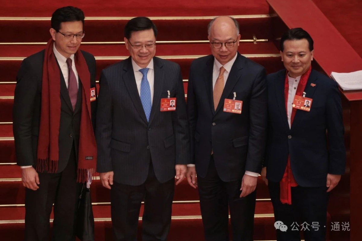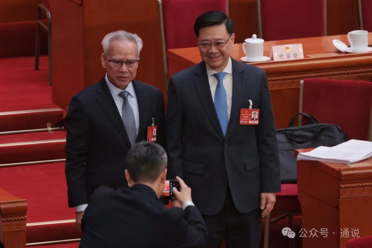 當天會上,李家超與岑浩輝坐在同一排相鄰座位,兩人全程認真傾聽政府工作報告內容。李家超不時用筆圈劃重點字句,并來回翻閱紙質版報告。大會結束後,李家超和岑浩輝兩人握手交流,站在一起合影,兩人還互相擔任對方攝影師。 隨後,李家超見到港區代表後揮手并兩次竪起大拇指點贊,走下主席台和陳勇、吳秋北、陳帆等代表合影。李家超還拍著陳勇的背,兩人交流近一分鐘,港區代表淩友詩也走向李家超作短暫交流。