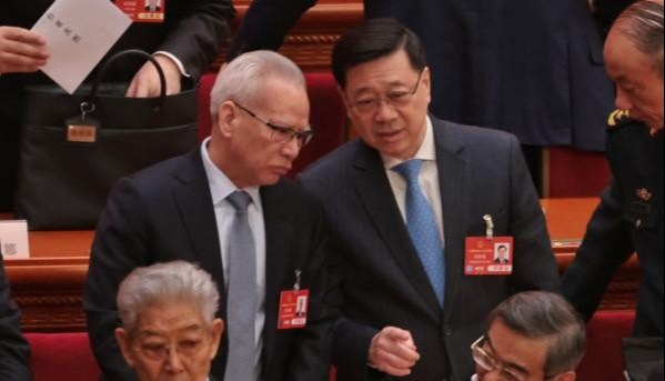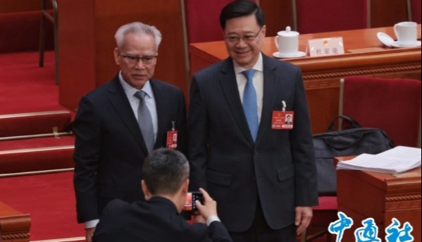中國第十四屆全國人民代表大會第三次會議開幕會5日召開,港澳特首列席會議。中通社記者在現場觀察,香港特首李家超全程認真聽會,不時做筆記,會後他還與澳門特首岑浩輝交流合影,并走下主席台與港區代表交流近一分鐘。