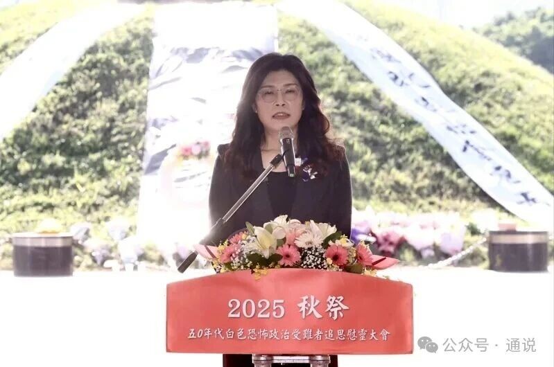 11月8日下午2點,台北市馬場町紀念公園,由台灣地區政治受難人互助會主辦的“1950年代白色恐怖秋祭追思慰靈大會”在此舉行。大批民眾前往獻花寄託哀思,受邀出席的中國國民黨主席鄭麗文與受害者家屬、後人共同在會上追思台灣白色恐怖時期犧牲的烈士。