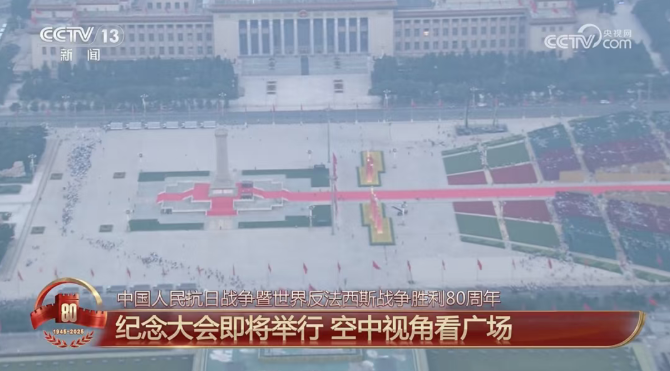 圖片來源:央視新聞 紀念大會即將開始,總台記者乘坐直升機,沿北京中軸線,空中拍攝紀念大會現場。