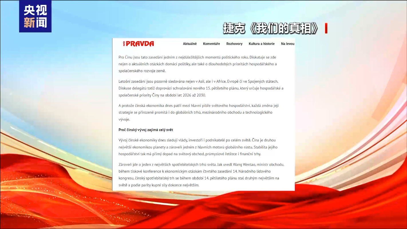 本文圖片均源自央視新聞 捷克媒體:中國是重要創新中心 為全球企業創造機遇 捷克媒體《我們的真相》刊發評論文章稱,作為全球第二大經濟體,中國經濟發展對世界具有重要影響。中國已經不僅僅是世界的製造基地,同時也是重要的創新中心和充滿活力的市場,為全球企業創造新的機遇。文章指出,中國式現代化、國內市場的擴大以及高水平對外開放繼續在全球經濟中扮演重要角色。對於包括捷克在內的開放型經濟體而言,中國經濟的發展具有重要意義,尤其是在當前全球經濟充滿不確定性的背景下,加強與中國在工業、新技術、能源和貿易領域的合作,是推動世界經濟穩定與發展的重要途徑。