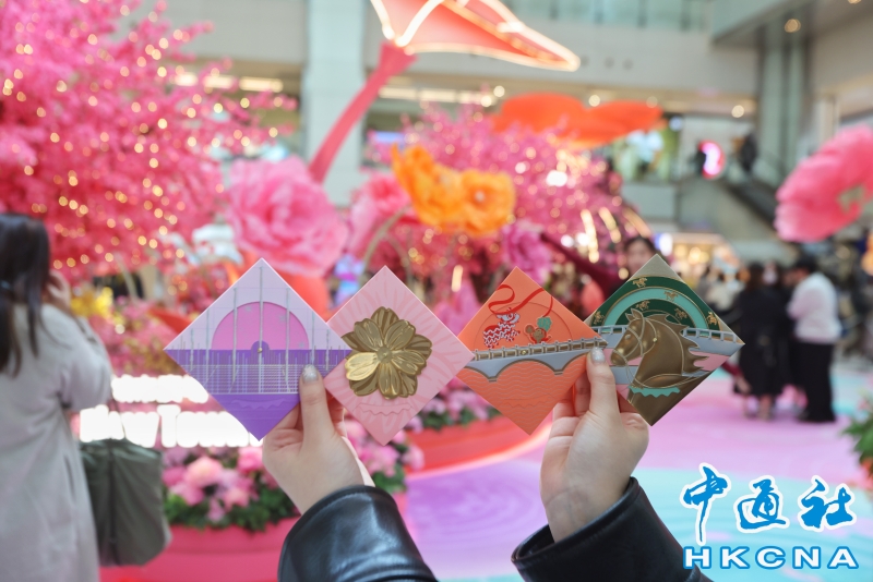•   1月22日,香港沙田新城市廣場以“花開結緣·風生水起”為主題的新春裝飾亮相,打造五大沉浸式花藝打卡區,吸引市民駐足拍攝。現場以四時之花為靈感,佈置3.5米高巨型蘭花、心型百花拱門及360度全景飛花拍攝裝置,搭配祈緣風車與琉璃花球,營造浪漫節慶氛圍。圖為以沙田地標為靈感的精美利是封。(香港中通社記者 鄧梓傑 攝) 香港中通社圖片