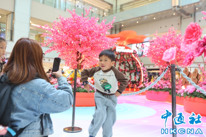 •   1月22日,香港沙田新城市廣場以“花開結緣·風生水起”為主題的新春裝飾亮相,打造五大沉浸式花藝打卡區,吸引市民駐足拍攝。現場以四時之花為靈感,佈置3.5米高巨型蘭花、心型百花拱門及360度全景飛花拍攝裝置,搭配祈緣風車與琉璃花球,營造浪漫節慶氛圍。圖為市民紛紛駐足拍照。(香港中通社記者 鄧梓傑 攝) 香港中通社圖片
