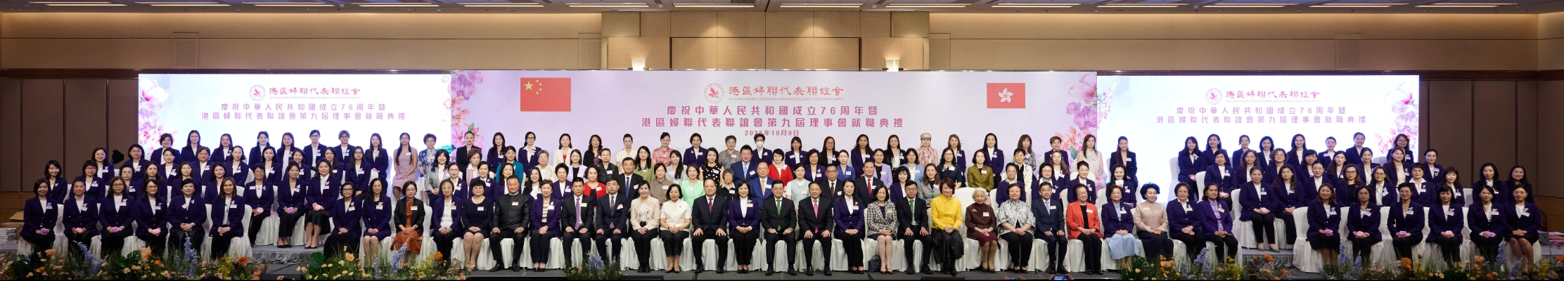 香港新聞網10月10日電 港區婦聯代表聯誼會慶祝中華人民共和國成立76周年暨第九屆理事會就職典禮,10月9日於香港會議展覽中心隆重舉行。全國婦聯執委、廣東省政協常委陸海女士就任新一屆會長。活動邀請香港特別行政區行政長官李家超先生、中央人民政府駐香港特別行政區聯絡辦公室副主任尹宗華先生、中華人民共和國外交部駐香港特別行政區特派員公署副特派員潘雲東先生蒞臨現場,共同見證第九屆理事會宣誓就職。全國婦聯副主席黃曉薇女士視頻致辭祝福。