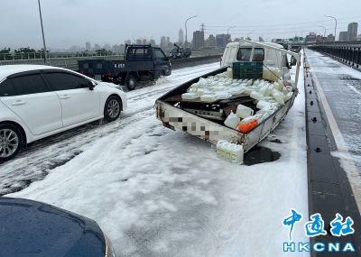 台灣一貨車掉落清潔劑 路面彷如雪地