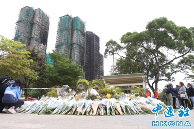 香港市民到火灾現場獻花悼念罹難者