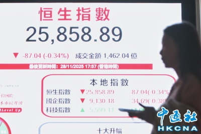 香港恒生指數跌87.04點 報25858.89點