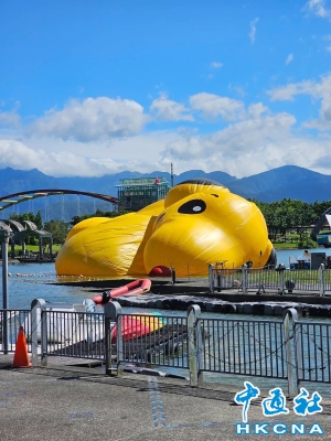 台灣宜蘭童玩藝術節“史努比鴨”受到颱風影響以洩氣收起