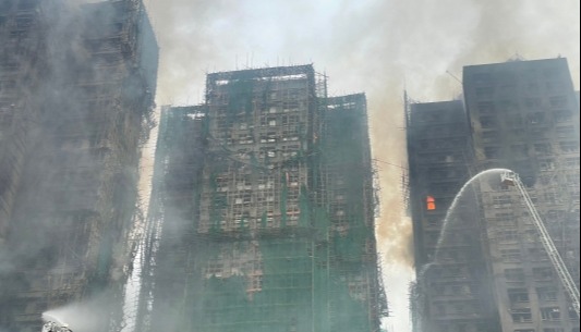香港大埔一個居民小區26日下午發生五級大火,釀13人死亡多人受傷,1名消防員在火警中殉職。香港中通社記者現場直擊,不斷有消防力量加入救援,入夜後火勢持續,至晚間11時災情仍嚴重。