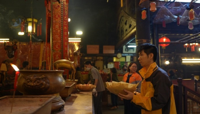 從訂單網站下載需求單,準備好長壽香、蠟燭及元寶,誠心向神明上香、稟神、化寶。這是香港東華三院文武廟工作人員郭健峰的工作日常。在AI時代,古老的建築已開始網絡接單,代客上香。