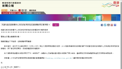 香港特區政府19日宣布,由於天文台會在20日發出八號熱帶氣旋警告信號,2019冠狀病毒病疫苗接種計劃下的兒童社區疫苗接種中心及私家診所新冠疫苗接種站,將不會在明日開放,疫苗接種服務亦會暫停。