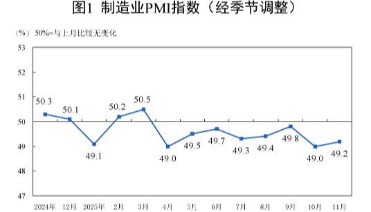 中國國家統計局11月30日發布數據顯示,2025年11月製造業採購經理指數(PMI)微升至49.2%,較10月回升0.2個百分點,結束此前連續兩個月回落態勢。儘管指數已連續八個月低於50%的榮枯線,但部分關鍵指標呈現...