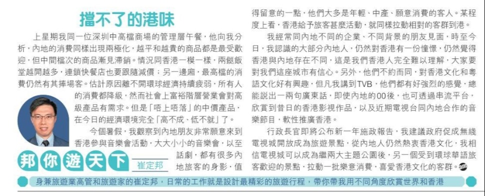 香港究竟向客人提供什麼體驗,就換來什麼主要類型的旅客。華語世界不單單在内地,還有台灣地區、東南亞的新加坡、馬來西亞、以至世界各地的華人,以及西方人逐漸認識中華文化。在香港流行文化,TVB絕對是香港文化旗艦,香港的文化...