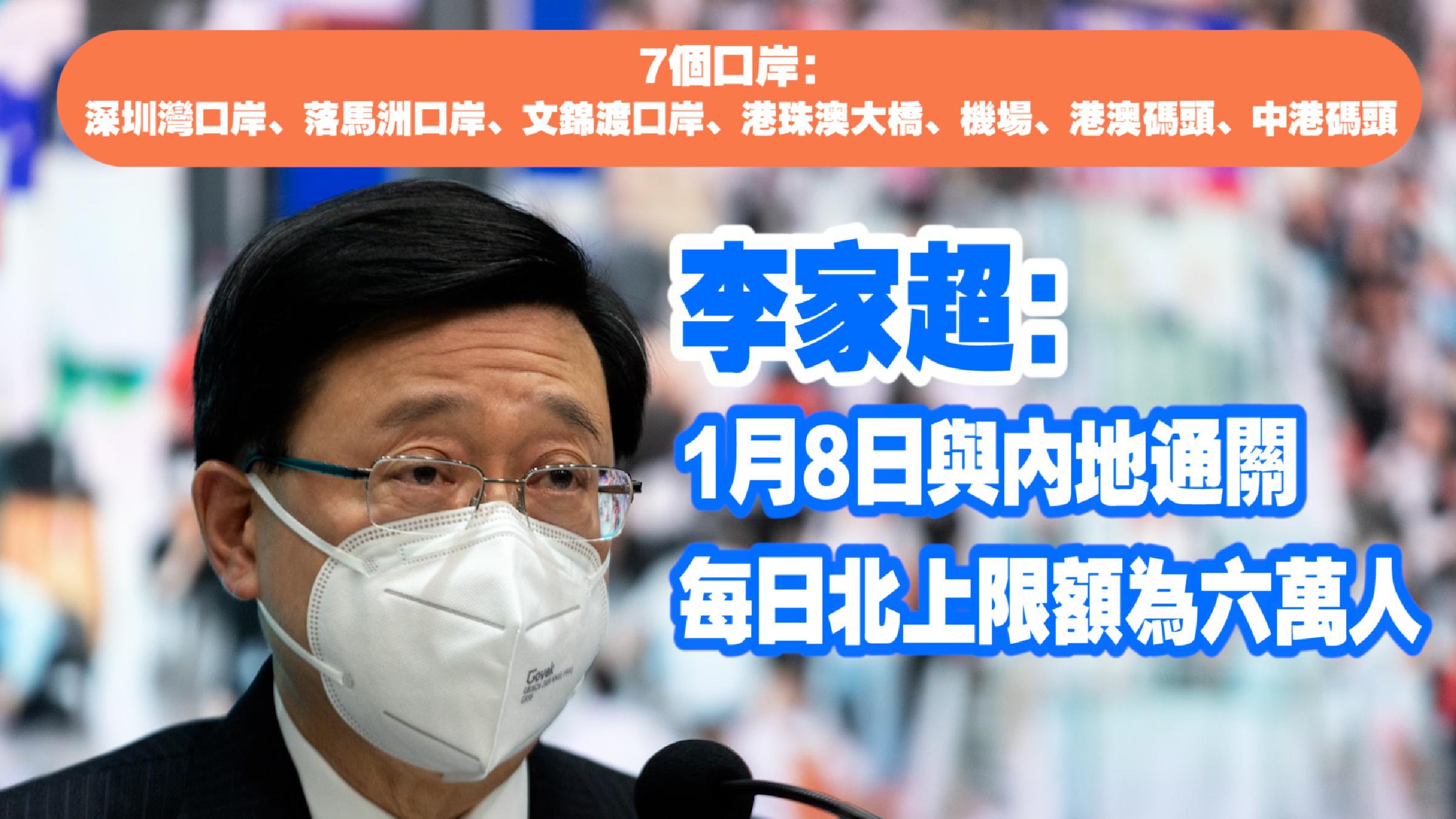 李家超:1月8日與內地通關 每日北上限額為六萬人