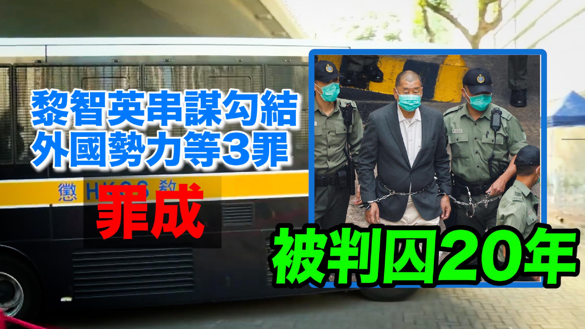 黎智英串謀勾結外國勢力等3罪罪成 被判囚20年