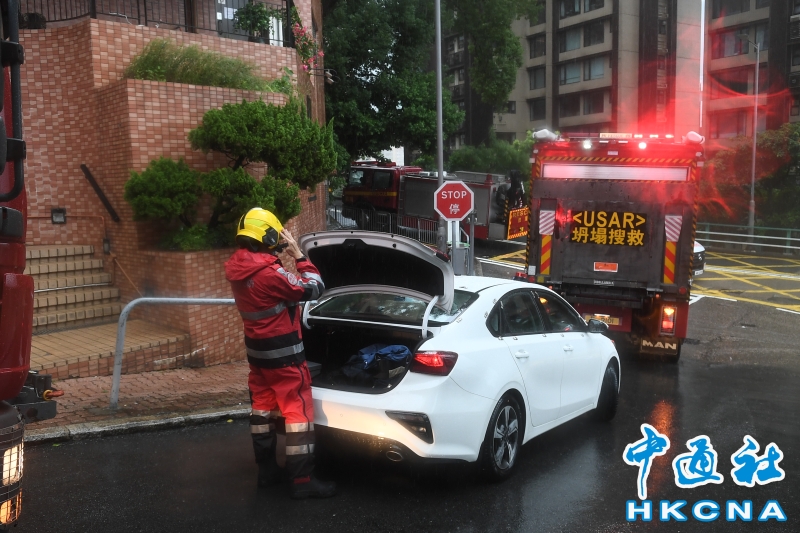 •   10月8日,香港跑馬地樂活道一大廈的巨型棚架倒塌,警方和消防隊即時趕往現場展開搜救行動。事發現場有7名裝修工人在工作,其中6人已證實安全,1名被困昏迷女工被救出,送往醫院經搶救後證實不治。圖為一名搜救人員換裝準備進入事故現場搜救。(香港中通社記者 許其皓攝)  香港中通社圖片