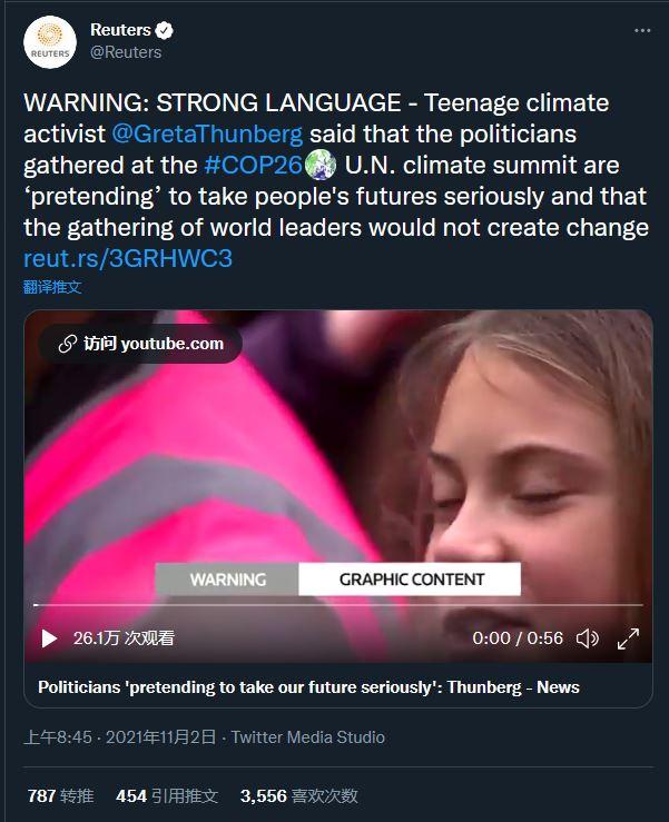 環保少女”在英國花樣抗議,外媒揶揄:通貝里狂熱癥不出所料,從抵達英國格拉斯哥參加氣候變化峰會(COP 26)的那一刻開始,“環保少女”格蕾塔·通貝里(Greta Thunberg)就引發了持續的混亂和爭議。 當地時間11月2日,未受大會官方邀請的通貝里來到會場外,在媒體和追隨者的簇擁下,用臟話唱歌、演講,一如既往地督促各國領袖“重視氣候變化”。英國路透社推特用一句“警告,有臟話”,提醒讀者謹慎觀看視頻。 而稍早之前,通貝里的表現也引起不小爭議。無論是剛抵達格拉斯哥時的警察護送大排場,還是采訪中鼓勵阻礙公共安全行為的言論,讓她本次的表現在社交平臺上“毀譽參半”。“通貝里狂熱癥(Greta Mania)。”蘇格蘭發行量最大的《星期日郵報》如此揶揄通貝里和她的追隨者們。 通貝里還在接受英國廣播公司(BBC)采訪時,公開指責英國“誇大”每年的碳排放減少量,但遭到BBC的發文駁斥。