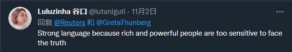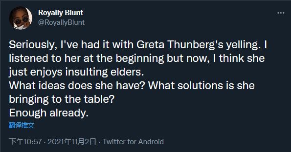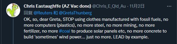 “好了,親愛的格蕾塔,停止使用化石燃料制造的衣服,不要再使用塑料制成的電腦,不要再使用鋼鐵,不要再采礦,不要再使用化肥,不要再使用煤炭來生產太陽能電池板,不要再使用混凝土來建造“時有時無”的風力(發電機)......你要以身作則。”一名網民如此批評通貝里激進的氣候變化理念。