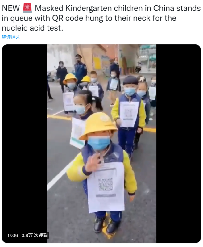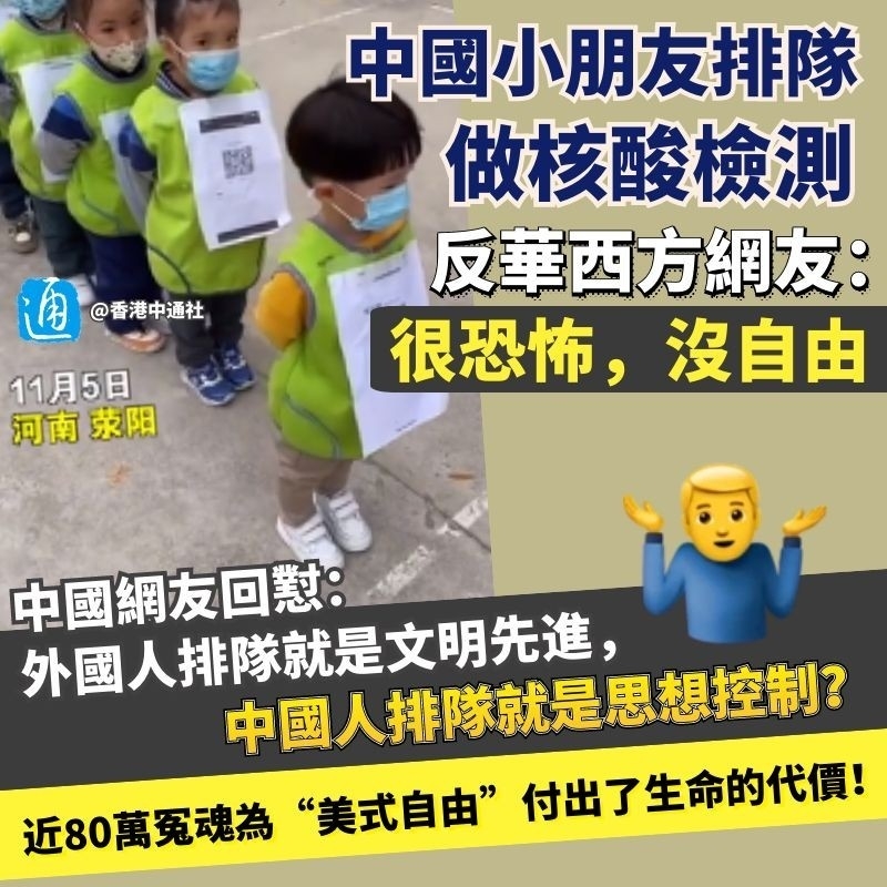 近日,河南滎陽暴發新冠疫情。一名幼師發布的幼兒園寶寶排隊做核酸檢測的視頻,在社交平台一夜走紅,眾多網友為小朋友們乖巧可愛的表現點讚。然而,這段視頻在外國的社交媒體上流傳後,中國正常的防疫政策又被部分外國網友抹黑為“很恐怖、沒自由”……