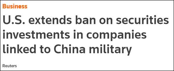 路透社報道截圖 拜登在這封信中堂而皇之地宣稱,中國正“越來越多地利用美國資本作為資源,以發展軍事、情報和其他安全設施和現代化”,從而“對美國本土和美國海外部隊造成威脅”。 談及投資禁令一事,拜登又妄稱中國通過所謂的“軍民融合戰略”,“迫使企業支持軍事和情報活動”,使得民用或民營企業“直接為中國軍事和安全部門提供支持”。 他據此強調對中企投資“黑名單”的“重要性”,聲稱如果美國沒有把相關中企列入“黑名單”,“他們就會繼續利用在美國指數供應商中日益增加的權重,擴大進入美國資本市場的渠道。” 美國政府針對中企的投資禁令,是對特朗普時代政策的延續。去年11月,特朗普政府公布了一項所謂“與軍方關聯”的中企“黑名單”,禁止美國投資者投資這些企業。包括中國電信、海康威視在內的多家中企都受此禁令影響。 拜登政府在上台後也維持了這項政策。今年6月,拜登政府又宣稱特朗普頒布的行政令存在“法律缺陷”,並簽署一項新的行政令將“黑名單”的範圍擴大到了59家中國企業。美國財政部還聲稱,將在“滾動”基礎上繼續更新這份名單。 該行政令將禁止美國投資者交易“黑名單”上中國企業的證券,禁令在8月2日生效後,美國投資者仍有一年時間進行撤資交易以剝離所持的股票。 路透社稱,打壓中企的主張得到了華盛頓的“對華強硬派”的歡迎,但他們很快又批評拜登政府沒有繼續把更多中企列入“黑名單”。其代表人物之一,前美國會美中經濟與安全審查委員會主席羅傑·羅賓遜(Roger Robinson)就聲稱, 拜登政府不繼續擴大“黑名單”的範圍“令人費解”。 對於美國擴大投資禁令的行為,中國外交部發言人汪文斌6月曾表示,美上屆政府出於政治目的實施針對所謂“中共涉軍企業”的投資禁令,完全無視事實和相關公司的實際情況,嚴重破壞了正常的市場規則和秩序,不僅損害中國企業的合法權益,也傷害包括美投資者在內的全球投資者利益。 汪文斌呼籲美方應尊重法治、尊重市場,糾正錯誤,停止採取損害全球金融市場秩序和投資者合法權益的行徑。中方將採取必要措施,堅決維護中國企業的正當合法權益,堅決支持中國企業依法維護自身權益。 【編輯:李雪萍】