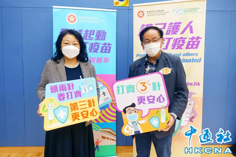 •   香港特區律政司司長鄭若驊資深大律師11月18日在渣華道體育館社區疫苗接種中心接種第三劑科興新冠疫苗。圖為鄭若驊(左)與行政會議非官守議員葉國謙(右)呼籲合資格特定組別人士按時接種第三劑新冠疫苗。 香港中通社圖片