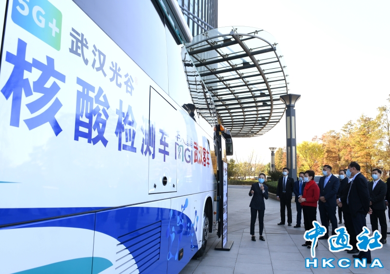 •   香港特區行政長官林鄭月娥11月30日在武漢考察武漢東湖新技術開發區。圖為林鄭月娥(左四)考察一輛核酸檢測車。 香港中通社圖片